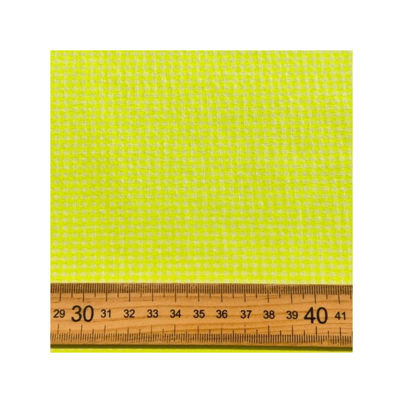 Tela de cuadro tipo vichy con un alto porcentaje de algodón con una composición 70% algodón, 30% poliéster y un ancho de 145 cm. Esta tela al tener el cuadro tejido es igual por las dos caras y tiene un ligero arrugado tipo seersucker. Ideal para faldas, vestidos, ropa infantil, sabanas, cortinas, bolsos, bolsas ...