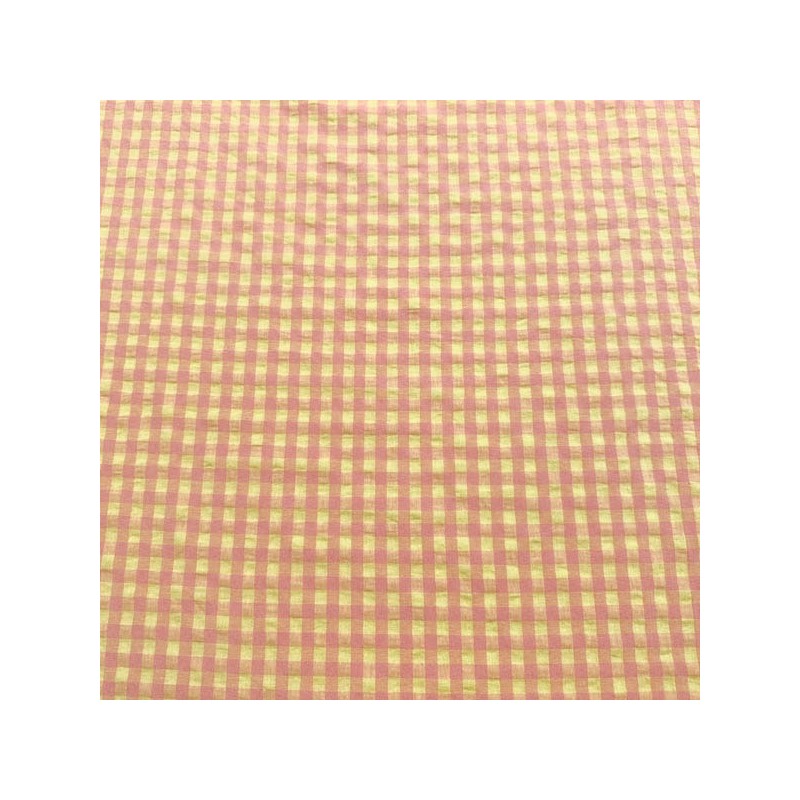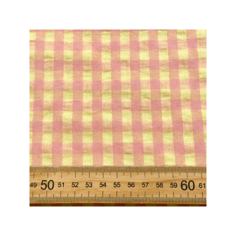 Tela de cuadro tipo vichy con un alto porcentaje de algodón con una composición 70% algodón, 30% poliéster y un ancho de 145 cm. Esta tela al tener el cuadro tejido es igual por las dos caras y tiene un ligero arrugado tipo seersucker. Ideal para faldas, vestidos, ropa infantil, sabanas, cortinas, bolsos, bolsas ...